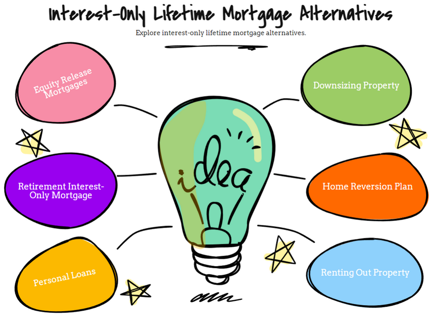 The alternatives to an interest-only lifetime mortgage include other equity release products, downsizing, a retirement interest-only (RIO) mortgage, or budgeting.