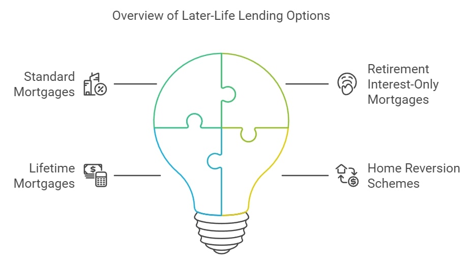 The later-life lending options are standard mortgages, retirement interest-only mortgages, lifetime mortgages, and home reversion schemes.