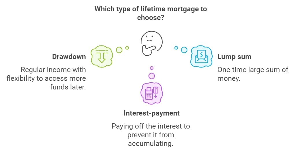 There are two main types of lifetime mortgages: lump-sum mortgages and drawdown mortgages.