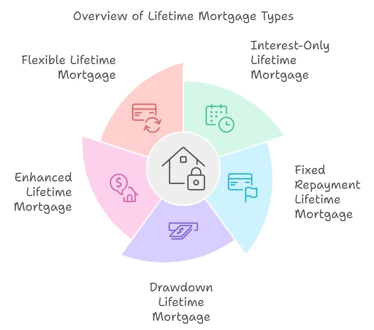 - Fixed Repayment Lifetime Mortgage: Repay a fixed higher amount than borrowed upon sale of the property, with no monthly interest payments.