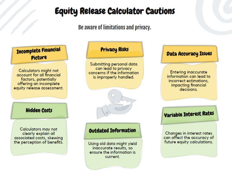 Limitations and privacy concerns you should be mindful of with equity release calculators are typically their ability to only provide estimates based on the data you enter, which may not account for all variables such as health conditions or specific property features.